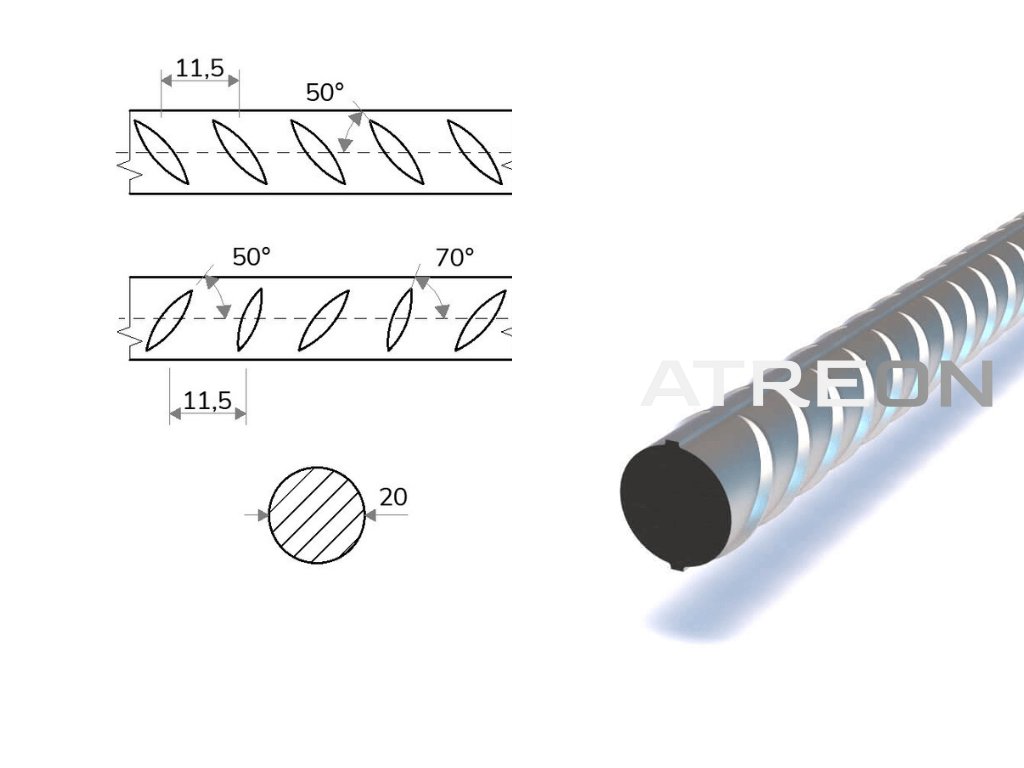 Betonstahl 20 mm ist Bewehrungsstahl der Güte B500B, der in Beton eingelegt wird, um dessen Tragfähigkeit zu erhöhen und die Verformung des Betons zu reduzieren. Es handelt sich um gerippten Betonstahl (auch Rippenstahl), der zur Herstellung von Stahlbeton verwendet wird. Gerade dank Bewehrungsstäben behalten Bauwerke Stabilität und Festigkeit und erreichen eine lange Lebensdauer. Die Bewehrung kann in Biegereien/Armierbetrieben gemäß der geforderten technischen Dokumentation geformt und gebogen werden. Der Durchmesser beträgt 20 mm; geliefert wird in der Produktionslänge von 6 m mit einem Gewicht von 14,82 kg. Das Gewicht pro Meter beträgt 2,47 kg.